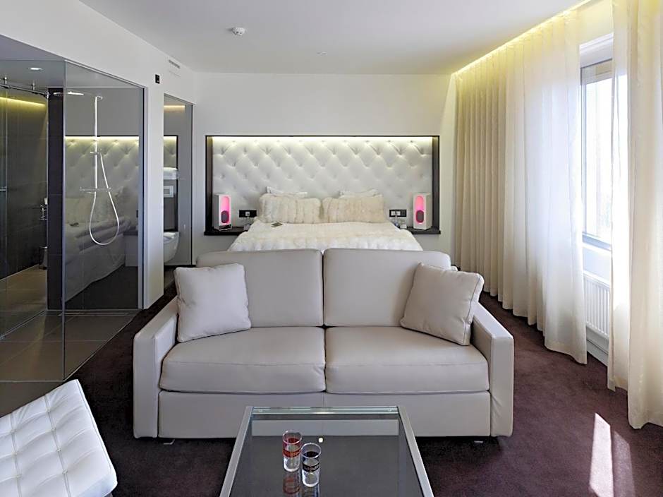 Located on the upper floors, these suites feature tasteful decor in warm colors, glass bathroom walls and a Nespresso coffee machine. They also come with bedside lamps from Night Cove and dimmable LED-lighting. The lounge area has a 63 in wide sofa bed in leather.